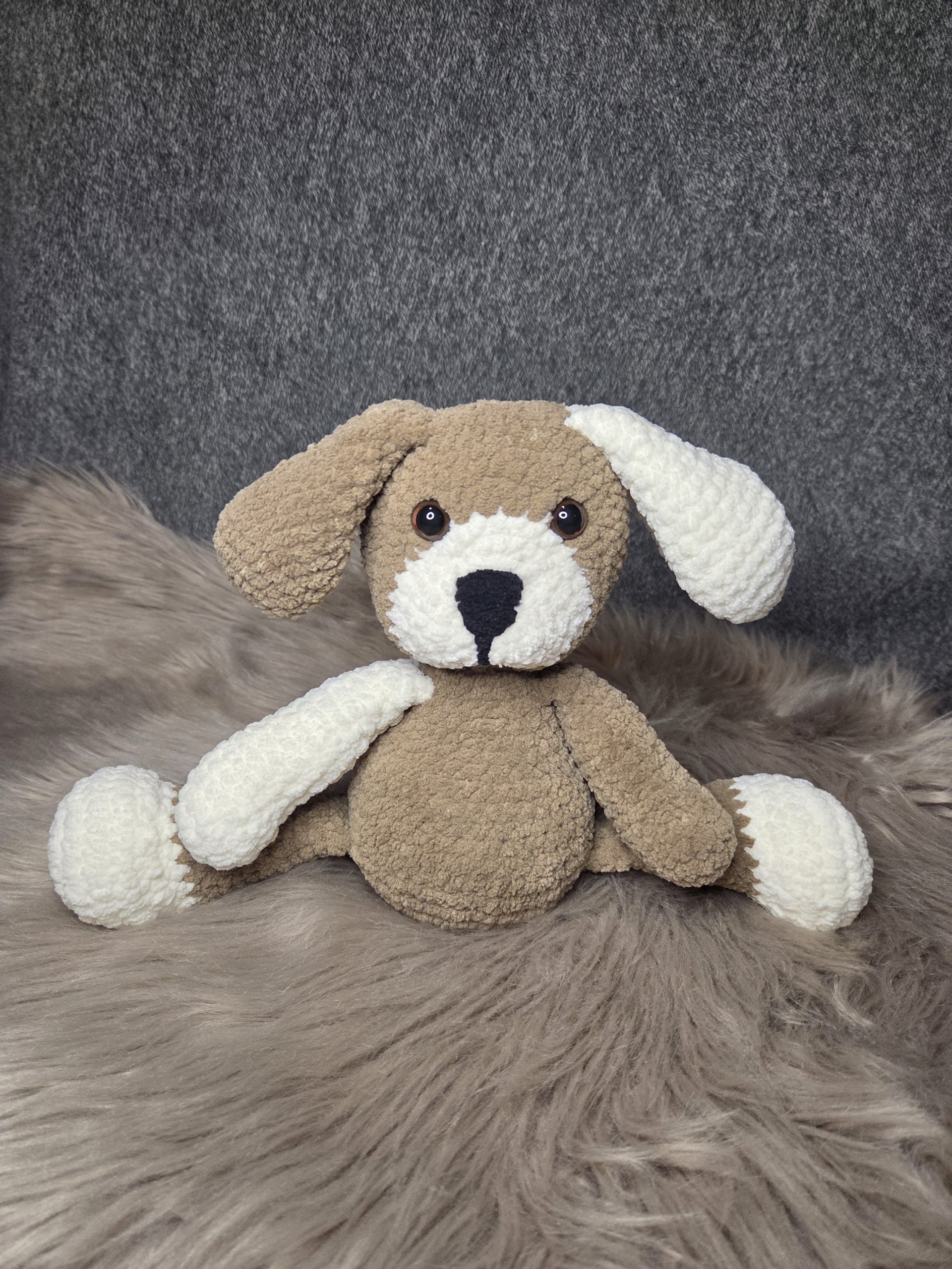 Tämä kaksi värinen koira on suloinen koriste lastenhuoneeseen ja vähän isompien lasten leikkeihin mukaan. Sitä on mukava halia ja helliä.